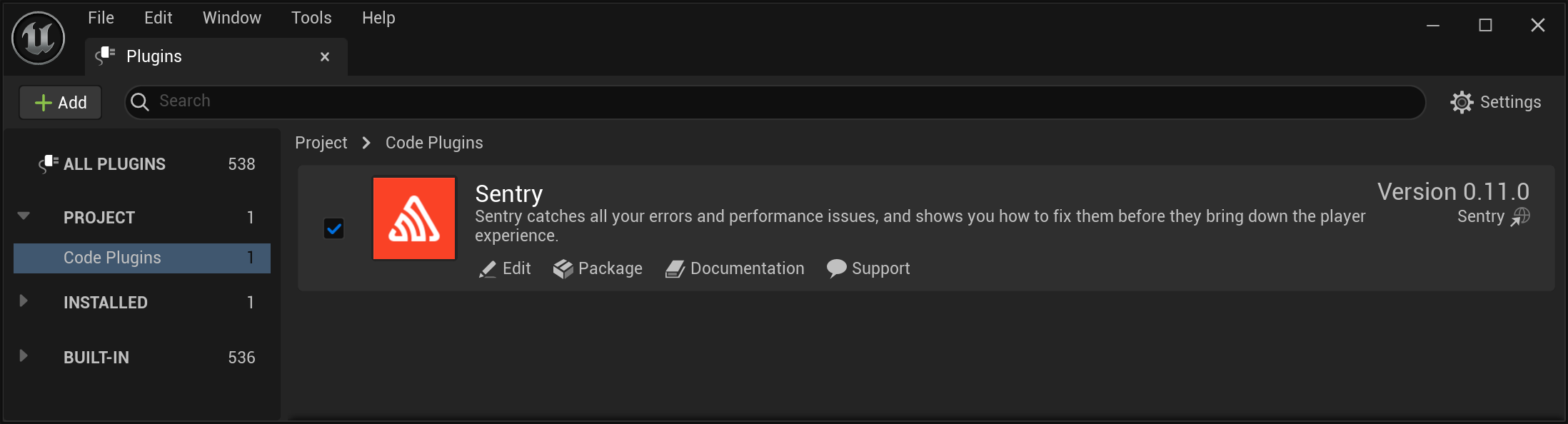 To make sure the Sentry plugin has been enabled after installation has been completed, go to the editor and navigate to the Settings > Plugins > Code Plugins menu and check for the installation.