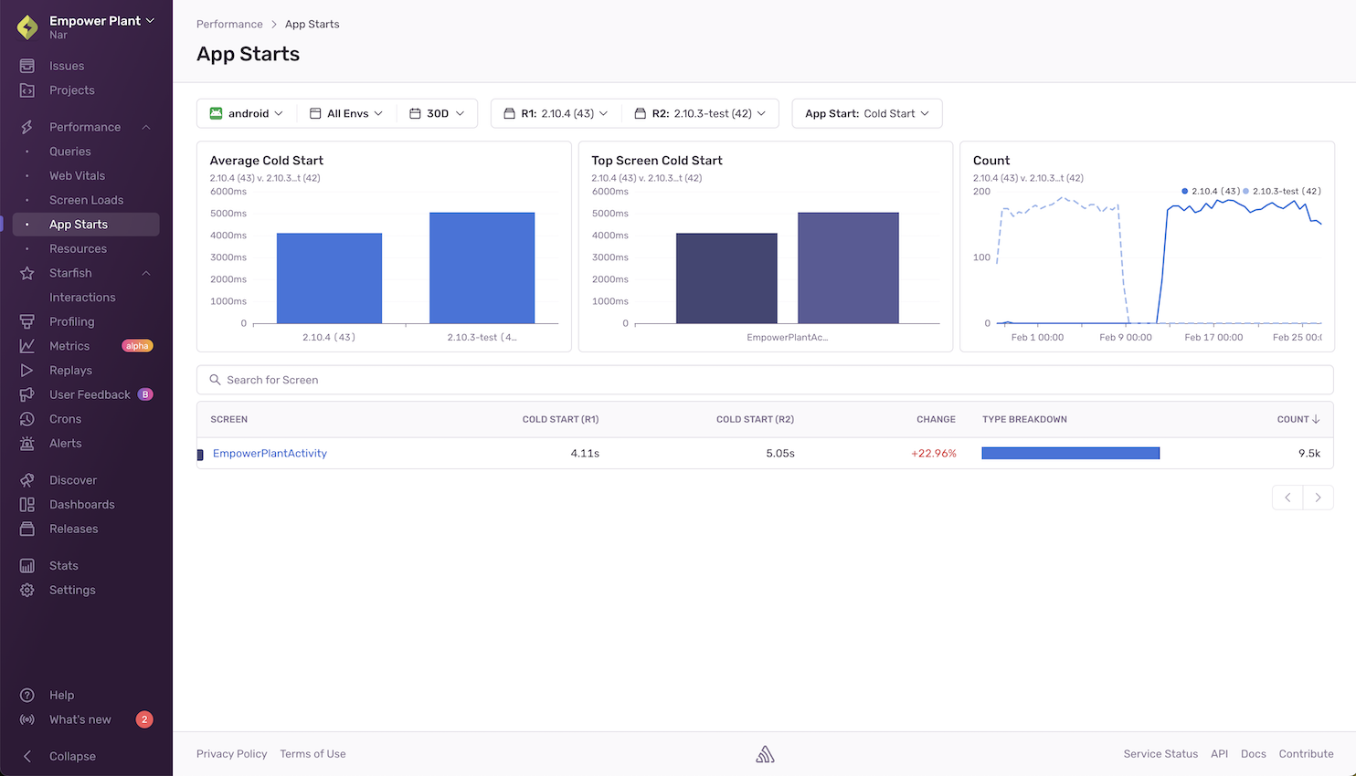 The App Starts page shows an overview of the amount of time it takes for your application to complete cold and warm starts. It helps you identify slow or regressed screens and gives additional information so you can better understand the factors contributing to the slowness of your application start times.